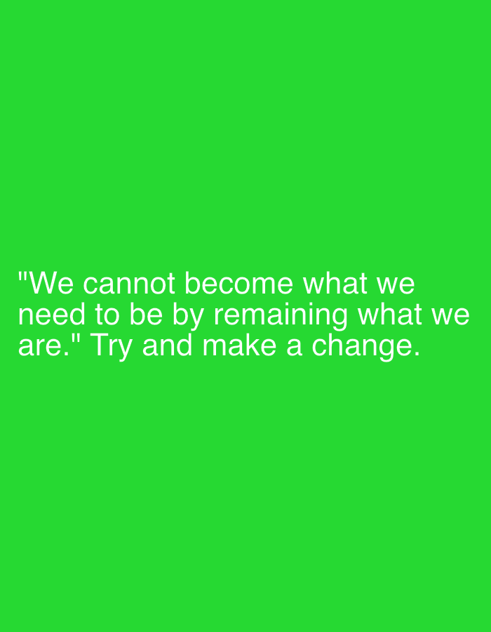 A vibrant green background hosts an inspirational quote in white text. The quote reads, "We cannot become what we need to be by remaining what we are." A call to action follows: "Try and make a change." The statement encourages personal growth and transformation through embracing change, suggesting stagnation is a barrier to becoming the best version of oneself.