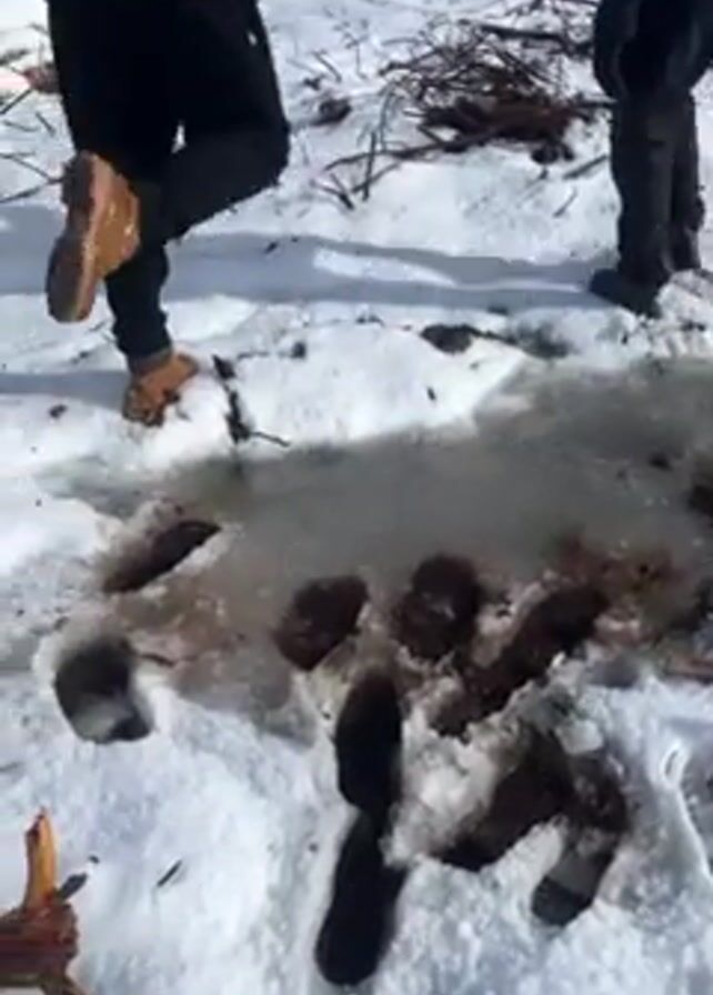 Two people are standing in a snowy area near a puddle with muddy footprints. The area appears to be an outdoor, possibly mountainous, region. The people are wearing dark jackets, dark pants, and shoes. One person is holding what appears to be a Coca-Cola can. They are both looking off into the distance, possibly at the landscape. There are scattered branches and debris on the snowy ground. The sky is overcast.