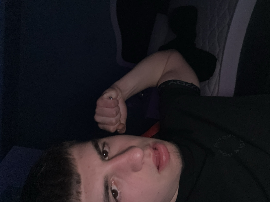 A young male is depicted in a dimly lit indoor setting in Bogomilovo, Bulgaria. He is positioned in the foreground, facing the camera with a direct gaze, his mouth slightly open, revealing the tip of his tongue. He has short, dark hair and fair skin. He is wearing a dark t-shirt. His right arm is bent at the elbow, with the hand clenched into a fist, presenting a flexed bicep. A silver-colored ring is visible on the ring finger of his right hand. The sleeve of his shirt on the right arm reveals a dark band with a lighter pattern near the bicep. The background is predominantly dark, with a portion of a white quilted mattress and a dark object, possibly a pillow or blanket, visible to the right. A dark headboard or wall panel is situated behind the mattress.