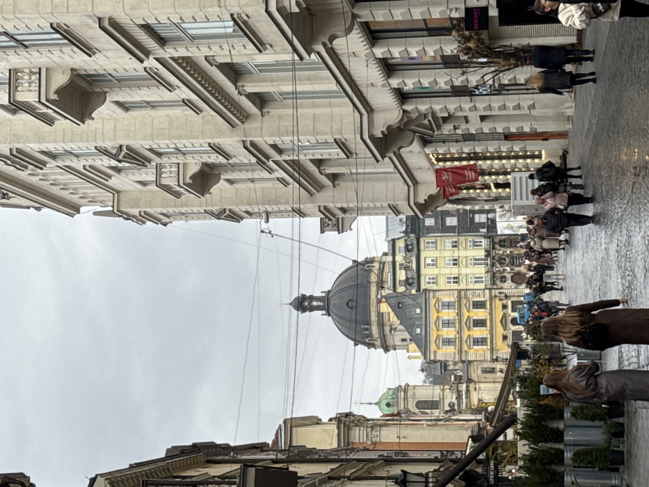 The image presents a street view in Lviv, Ukraine, looking eastward down a cobblestone pedestrian street towards the Dominican Church and Monastery (Church of the Holy Eucharist). The central background features the large, dark-domed Dominican Church, topped with a smaller cupola. To its left, a second, smaller church spire with a green dome is partially visible. The foreground depicts a wet, cobblestone street. Two female individuals, seen from behind, walk away from the viewer. The person on the left wears a dark long coat, and the person on the right wears a dark brown long coat and a black backpack. To the immediate left, an area with multiple planter boxes containing green plants is present, partially covered by a dark awning. On the right side of the street, a multi-story building with a light-colored, patterned stone facade, multiple windows, and decorative balconies extends into the frame. Two vertical red banners with white text and string lights are affixed to this building. A shopfront sign displaying "SECRET" is visible. On the left, a portion of another historic building with a light-colored facade and an outdoor cafe setting is visible. The midground is populated by numerous pedestrians walking in various directions. A blue vehicle is present further down the street. The buildings lining the street are multi-story historic structures exhibiting various shades of yellow, light grey, and dark grey. Overhead wires traverse the sky. The sky is overcast and uniformly grey.