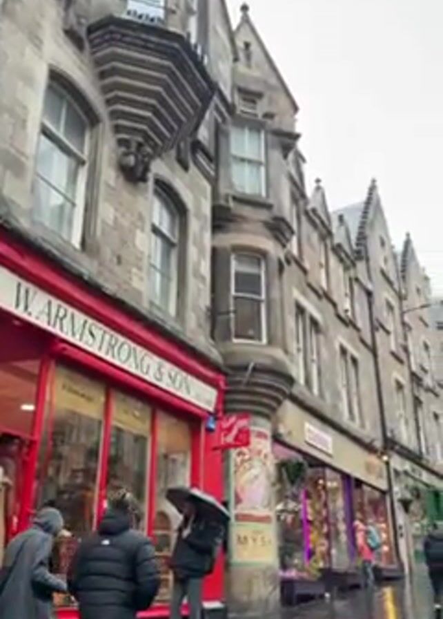 The video presents a street scene in what appears to be a European city. The street is wet, suggesting it has recently rained. The buildings lining the street are made of stone and have a historical architectural style. On the left side of the street, a store called "W. ARMSTRONG & SON" with a red facade stands out. People are walking along the street, some carrying umbrellas. The camera pans up to capture the full view of the street and the buildings. The sky is overcast. A black car is visible parked on the street further up.