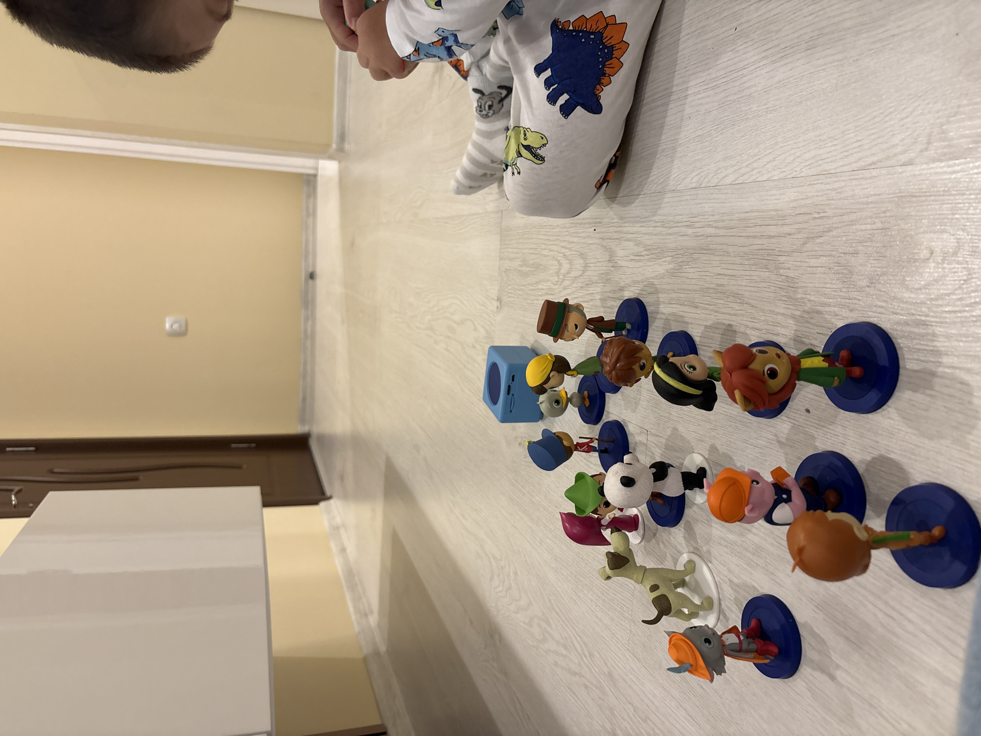 A child wearing dinosaur-themed pajamas is playing with figurines on a light-colored wood-patterned floor. The figurines, arranged in a row, include cartoon characters with blue bases and a small blue cube. The photo is taken from a high angle, showing part of the child's head and hands, and includes a partial view of a white cabinet against a light yellow wall. The precise location of Radilovo, Bulgaria, cannot be determined from the image.