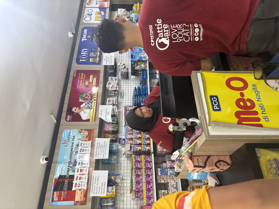 store selling pet food and supplies. A person wearing a red shirt with the text "Cattie Care LOVE YOUR CAT?" is standing next to a cashier wearing a black hijab and a similar red shirt, who is operating a Lenovo computer at the counter. Shelves are filled with various products, including brands like "Tory" and "Cleo." A large yellow Me-O advertisement features Nagita. Promotional materials are displayed for Japfa Comfeed Indonesia Tbk, mentioning discounts and series of pet food.