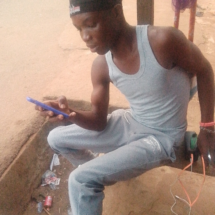 A young, slender man sits outdoors, engrossed in a blue smartphone. He wears a gray tank top and light-colored sweatpants with a logo on the left leg. The man has on a black headband with white lettering. He is sitting on a concrete ledge, with trash scattered on the ground nearby. His left arm is resting on his leg, while his right hand holds a flashlight and headphones. He wears a pink beaded bracelet on his right wrist.