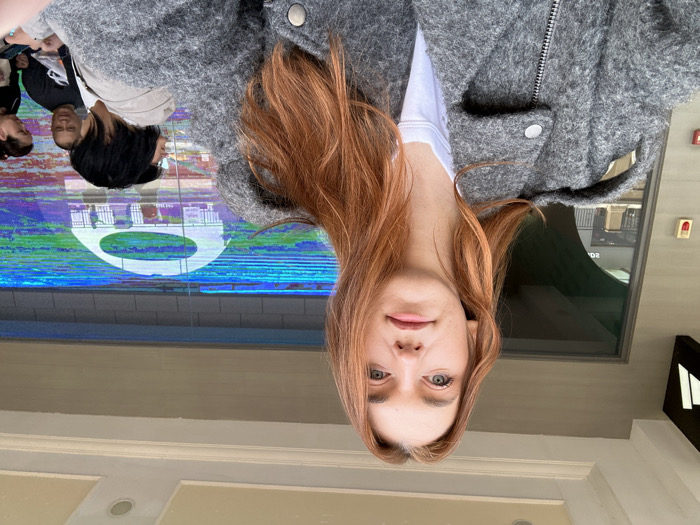 A fair-skinned woman with red hair and blue eyes looks directly at the camera. She wears a white shirt and a gray wool jacket. Behind her, a group of people are reflected in a glass wall with a large, circular logo. A storefront and various building details are visible, suggesting an urban setting. The image appears rotated.