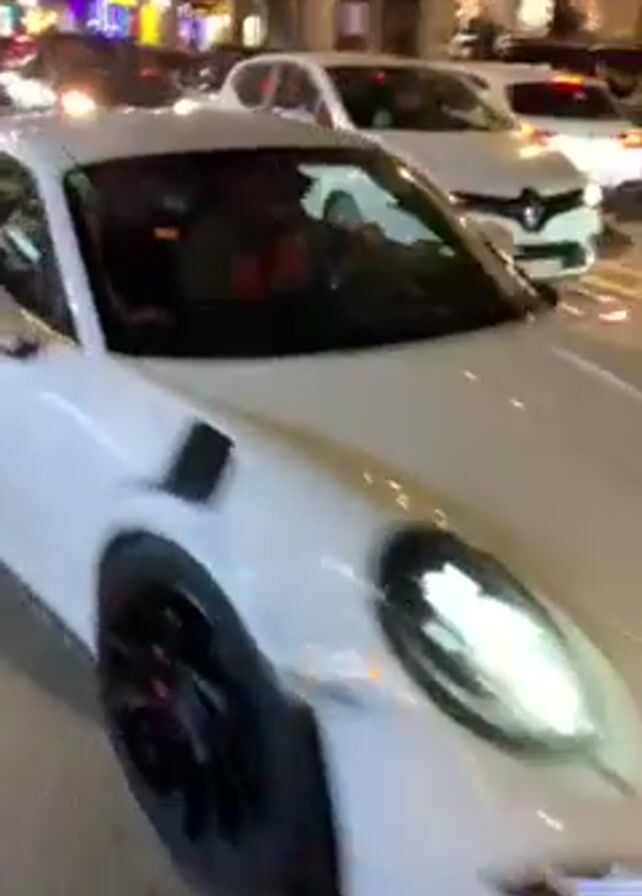 The video, taken at night, showcases a white Porsche driving on a city street amidst other vehicles