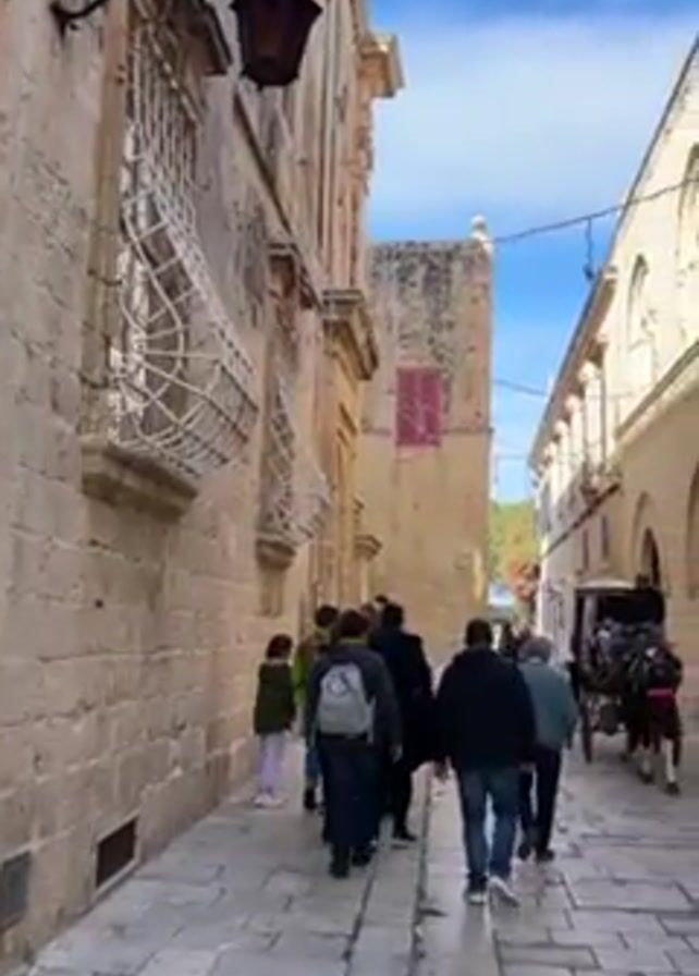 A narrow cobblestone street scene is captured in this daytime video. A group of people walks down the street, with a horse-drawn carriage heading towards them. The buildings on either side are constructed of light-colored stone. The building on the left features a window with an ornate metal grill and a vintage lantern. The building on the right exhibits arched windows and decorative moldings. A man drives the horse-drawn carriage, which carries passengers. The horse is harnessed and wears a bright pink nose covering. Festive hanging decorations are strung above the street. The sky is blue with scattered clouds.