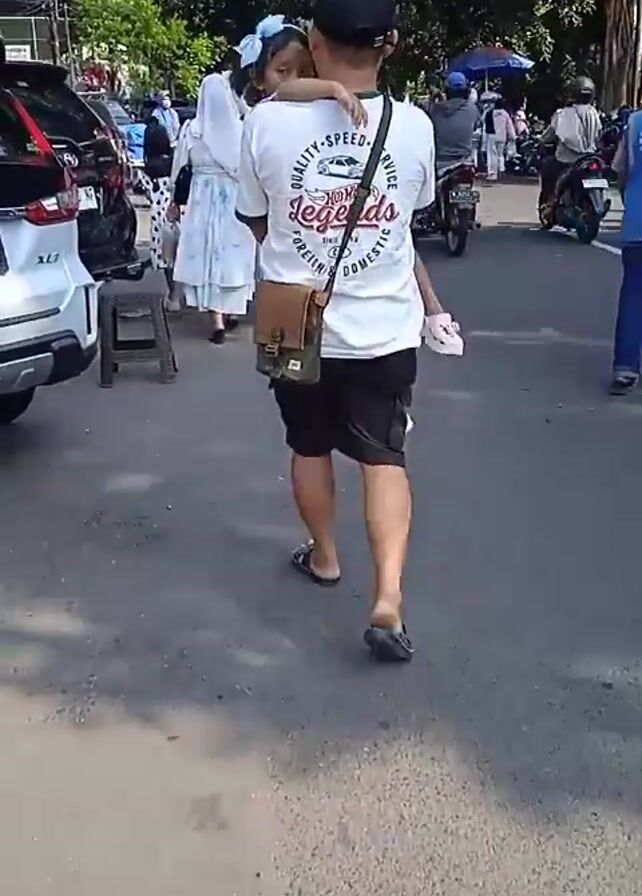 A man is carrying a small girl on his shoulder while walking on a street. The man is wearing a white t-shirt with the word "Legends" on the back, black shorts, sandals, and a black baseball cap. He has a brown bag slung over his shoulder. The girl is wearing a white headband and is holding onto the man's shoulder. There are other people walking around on the street, including a woman in a white dress and a girl in a polka dot dress. There are parked cars on the side of the street. A black car and a white car are visible on the left. There is a brown stool next to the white car. The street is paved and there are trees in the background.