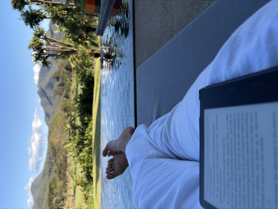 The image depicts an outdoor leisure scene in Pai, Thailand, viewed from a first-person perspective. In the foreground, a person's lower torso and legs are visible, clad in loose white clothing, resting on a grey lounge chair. Their bare feet are elevated. An e-reader with an illuminated screen displaying illegible text rests on their lap. Immediately beyond, an infinity pool with blue water and dark tiling stretches across the frame. A person is partially submerged in the pool, facing away from the camera, with their head and upper back visible; they appear to be floating or resting in the water, possibly utilizing a circular floatation device. Beyond the pool, a vibrant green landscape unfolds, featuring a strip of mown grass followed by dense tropical foliage and tall trees. In the distant background, a range of green, rolling mountains rises under a clear blue sky dotted with scattered white clouds. A small orange decorative pot is visible on the right edge of the pool deck.