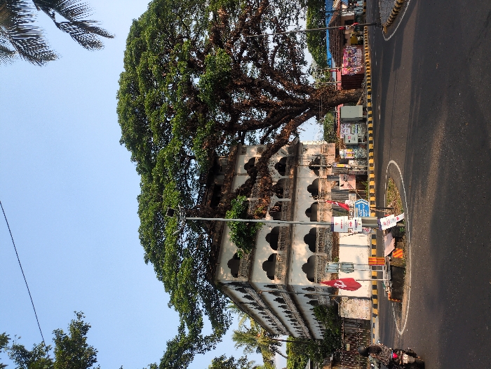The image displays an urban intersection in Kochi, India, under a clear light blue sky. A three-story, light-colored building with arched balconies on each level is situated on the left, largely overshadowed and partially overgrown by the dense canopy and thick branches of a massive, mature tree rooted beside it. The asphalt road forms a circular roundabout, demarcated by black and yellow striped curbing. The central island of the roundabout contains sparse vegetation, a multi-headed street lamp pole, a blue directional sign, additional informational signage (some pertaining to "National Games India"), and two red flags. A dark-colored motorcycle, operated by a helmeted individual, is visible on the left segment of the road, proceeding away from the viewer. On the right side of the intersection, smaller commercial structures exhibiting posters line the roadside. Natural daylight illuminates the scene, casting shadows across the road surface.
