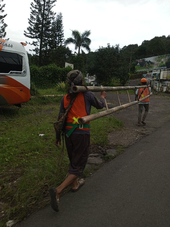 The scene depicts an outdoor environment, possibly a rural or semi-urban area, in Adhanur, India. Two individuals are observed walking along the edge of an asphalt road from left to right, away from the viewer. The person in the foreground, facing away, has long hair covered by a green camouflage bandana, wears a dark long-sleeved shirt under an orange reflective safety vest with a prominent yellow X-shaped marking on the lower back, dark brown pants, and mismatched footwear (one dark sandal, one brown slipper). This individual is carrying a bamboo structure resembling a ladder or barrier, resting on their right shoulder and secured around their waist with a green strap or belt featuring a large silver buckle. A dark bag or pouch hangs from their left shoulder. The second individual, further down the road and also facing away, wears an orange hard hat, a light blue long-sleeved shirt under an orange reflective safety vest with vertical yellow reflective strips, and light-colored pants. To the left of the road, a grassy shoulder is visible, alongside the rear portion of a white and orange passenger bus with "Class" written on its side. Beyond the bus and grass, dense green vegetation, including tall coniferous trees and a palm tree, is present. The background features a sloping, heavily forested hillside under an overcast sky. To the right of the road, past the second individual, there is additional dense foliage and a large billboard with an image of a landscape, mounted on a structure next to what appears to be a concrete wall or building. The road surface shows some cracks and irregularities.