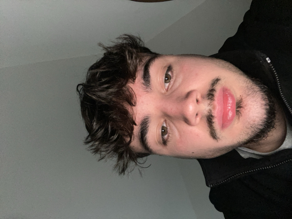 The image depicts a close-up portrait of a single male subject. He possesses dark, wavy, disheveled hair, brown eyes, and dark facial hair including a mustache and chin beard. He is clad in a dark, zippered jacket over a light grey inner layer. His lips are slightly parted. The subject is oriented directly towards the camera. The background is a plain, light grey surface, consistent with an interior wall or ceiling. Overhead or frontal artificial lighting illuminates the scene. No identifiable landmarks or unique features are present to determine a specific location within Bragança, Portugal.