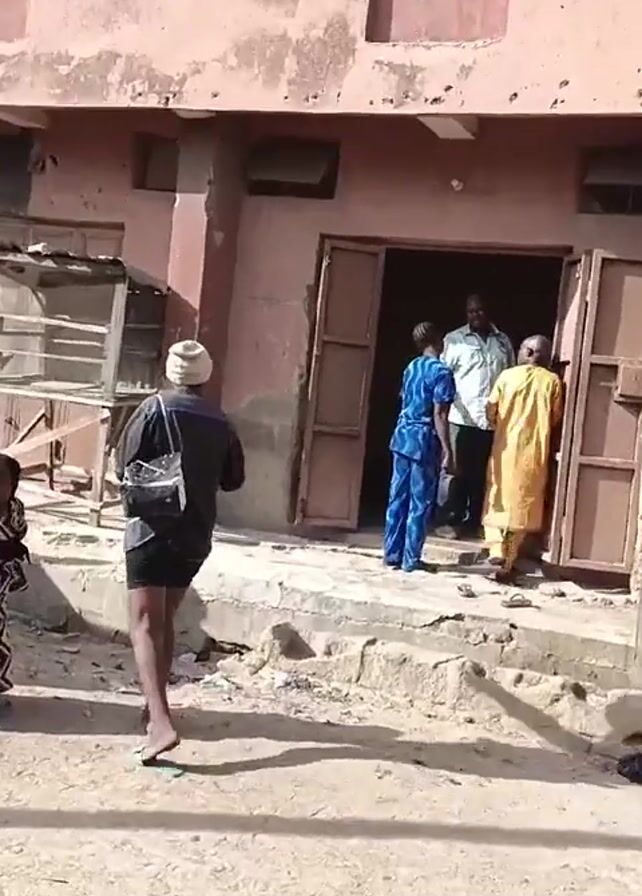 street scene with a faded pink two-story building in the background. The building has two windows with iron bars and a wide open doorway where four people are visible. A woman in a blue suit and a man in a yellow robe are standing on the stoop talking to a man in a white patterned shirt and dark pants. A man in a dark shirt and shorts is standing on the dirt road facing the building and taking a picture of the scene with his phone. A man in a green shirt is talking on his phone. There are two children dressed in yellow and dark patterned clothing next to the man taking the picture. The road is sandy and dirty.