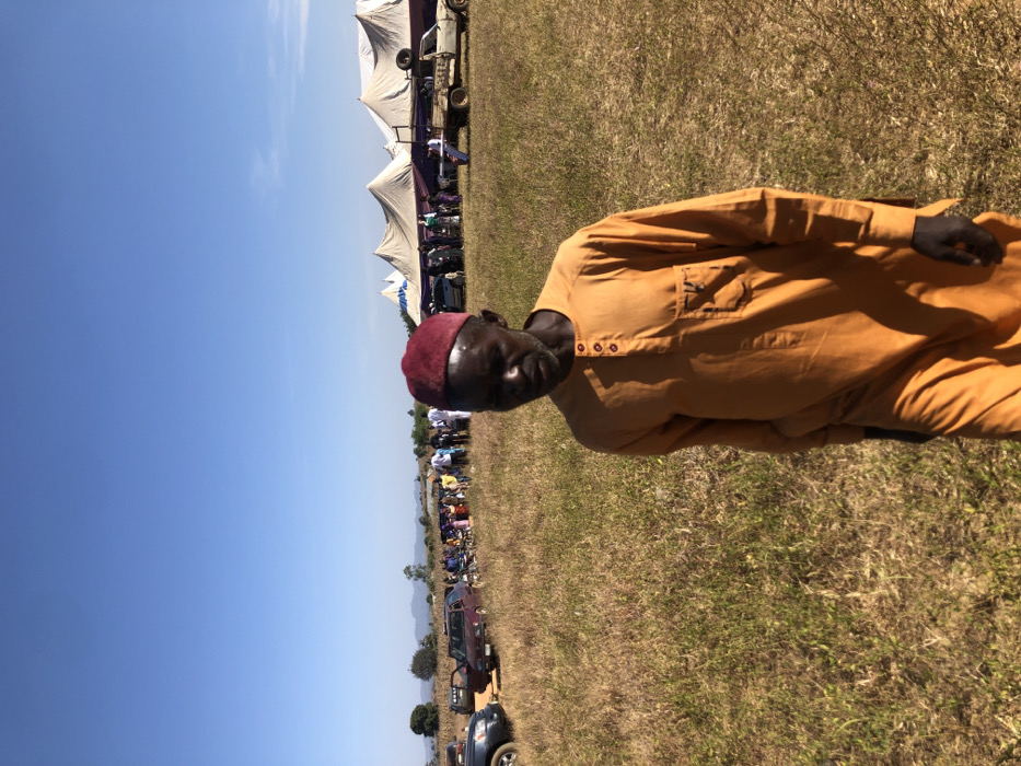 An outdoor image shows a man wearing a maroon cap and an orange button-up shirt. He stands on a grassy field on a sunny day with a clear blue sky. In the background, there are tents, a crowd of people, and parked vehicles, suggesting an outdoor event or gathering. The image is rotated sideways, placing the man on the right side of the frame.