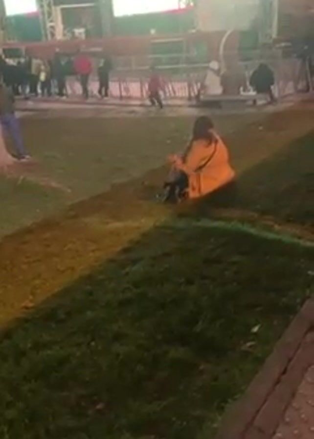 woman sitting on a grassy slope, interacting with a black and white cat. The woman is wearing a tan coat and is seated with her legs crossed. The cat is near her, and she pets it. In the background, there's a crowd of people behind a barrier in front of a stage with a large screen. The scene appears to be at night, with artificial lighting illuminating the area. A few people are visible standing or sitting further back. A sidewalk with tactile paving is visible in the foreground.