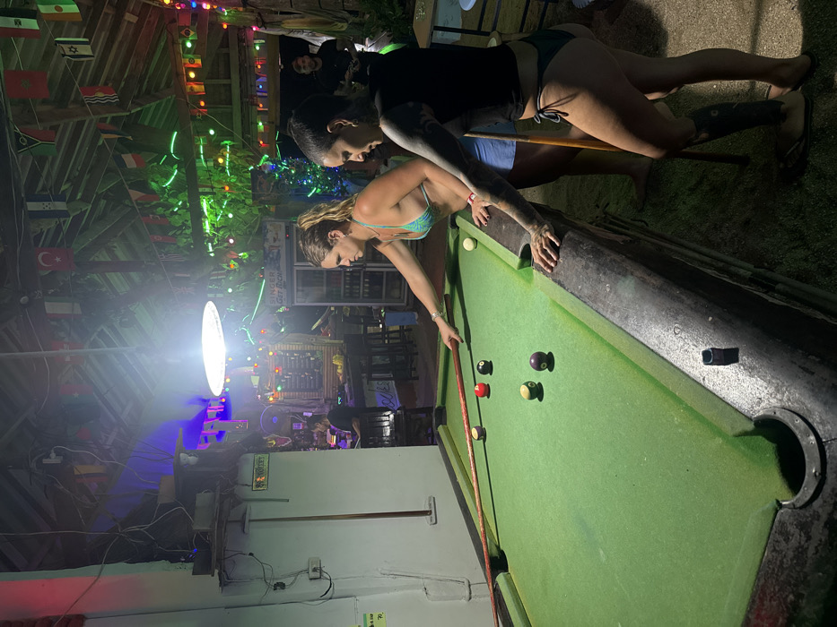 The image depicts a nighttime scene within a casual, open-air bar or recreational establishment in Baan Tai, Thailand