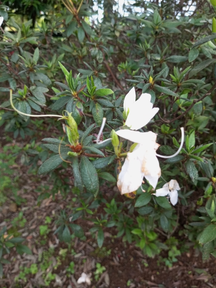 A close-up photograph depicts a flowering shrub within the city of Naya andura, India. The plant features dense, dark green, ovate leaves. Three white flowers are visible: two prominent, bell-shaped blossoms in the mid-right, one appearing fresh and the other displaying browning on its petals, and a smaller, wilted specimen near the lower right. Each flower exhibits long, curved, white stamens or styles. A green, elongated seed pod is present on the left, accompanied by a thin, white filament. The immediate ground cover consists of brown leaf litter and soil. Background foliage is blurred green. No individuals are present.