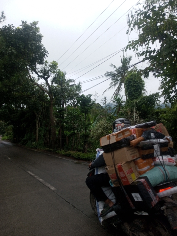 A person rides a scooter overloaded with packages on a wet road. The packages are stacked high and secured with rope. Lush green vegetation lines the roadside, including trees and various plants. Utility lines stretch across the sky, which is overcast with grey clouds. The scene suggests a rural or developing area with the transport of goods via scooter on a damp day.