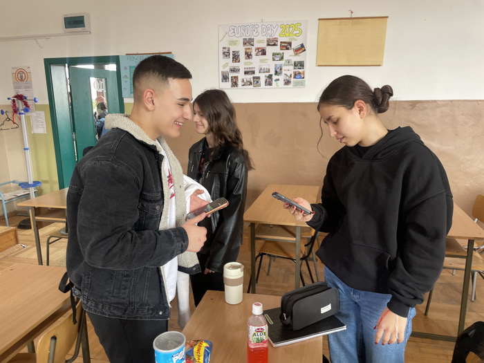 The image depicts a school classroom in Panagyurishte, Bulgaria. The room features light-colored walls, wooden desks, and chairs. A green door with a visible sign reading "ВХОД" (Entrance) is present on the left. On the back wall, a poster titled "EUROPE DAY 2025" displaying various images is affixed, alongside a blank scroll. Three young adults are visible. In the left foreground, a young male with short dark hair and a light skin tone is wearing a dark denim jacket with a white fleece lining over a white t-shirt. He is smiling and looking to his right, holding a dark-colored smartphone in his right hand with his thumb up. A white cloth or garment is held in his left hand. To the right of the male, a young female with dark hair pulled into a bun is wearing an oversized black hooded sweatshirt and blue jeans. She is focused on a dark-colored smartphone held in both hands, looking down at the screen. Her fingernails are painted red. Between these two, a third young female with long dark wavy hair is partially visible, wearing a black leather-like jacket. She is looking towards the female in the black hoodie with a faint smile. On the wooden desk in the immediate foreground on the right, several items are placed: a cylindrical white and brown travel mug, a black zippered pencil case, a black spiral-bound notebook, a red bottle of "ALOE" drink, a partially visible blue can (possibly Pringles), and a partially visible yellow/orange snack packet. The individuals appear to be engaged in a casual interaction, possibly during a break.