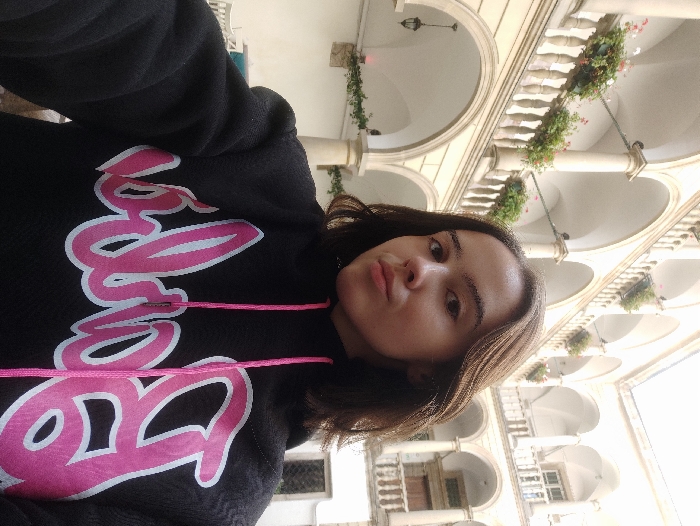 A young female subject, facing the camera, occupies the left side of the frame. She has shoulder-length dark brown hair, dark eyebrows, and is wearing a black hoodie featuring a prominent pink and white "Barbie" logo across the chest with pink drawstrings. Her expression shows a slight pout. The background reveals the multi-story arcaded Italian Courtyard of the Korniakt Palace (Lviv Historical Museum) in Lviv, Ukraine. The courtyard walls are constructed from light-colored stone or stucco, showcasing multiple levels of arches supported by columns. Balustrades line the upper levels, adorned with planters containing green foliage and pink flowers. A hanging lantern is visible beneath the first-floor arcade on the left. Partial views of white outdoor seating are discernible in the lower-left background.