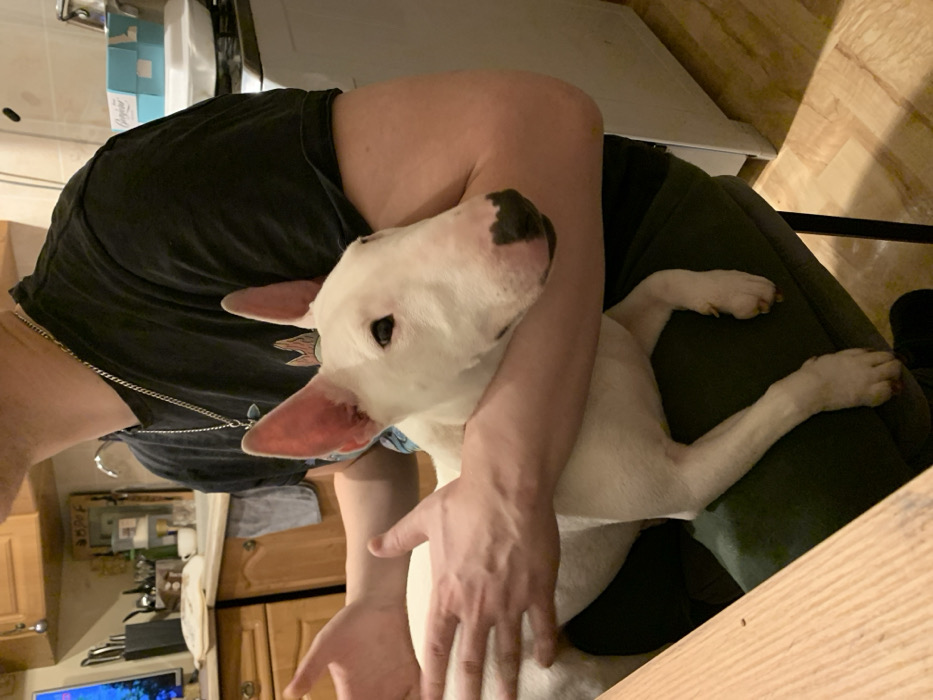 - "A white bull terrier with a black spot on its nose is nestled in a person's lap" by FM-RWjjF2, licensed under CC BY 4.0