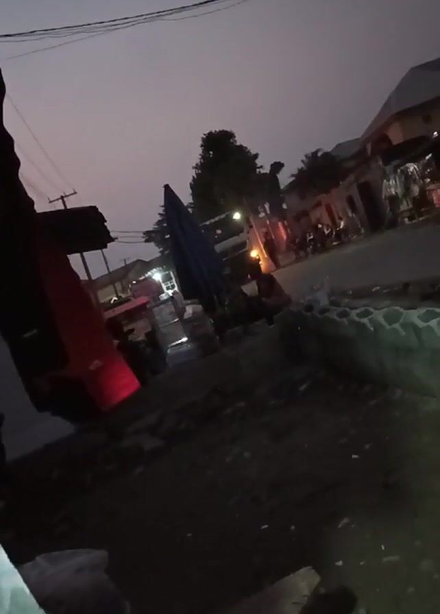 street scene at dusk. There is a pile of gray concrete blocks or cinder blocks visible in the lower right corner of the frame. A large white truck approaches from the middle of the frame, its headlights on. There are several small stalls and buildings visible along the street. The sky is a twilight color. There are people standing and sitting near the stalls in the background. Electrical wires are visible across the top of the frame. The foreground is dark and appears to be a dirt or gravel surface. A red object is partially visible on the left side of the frame.