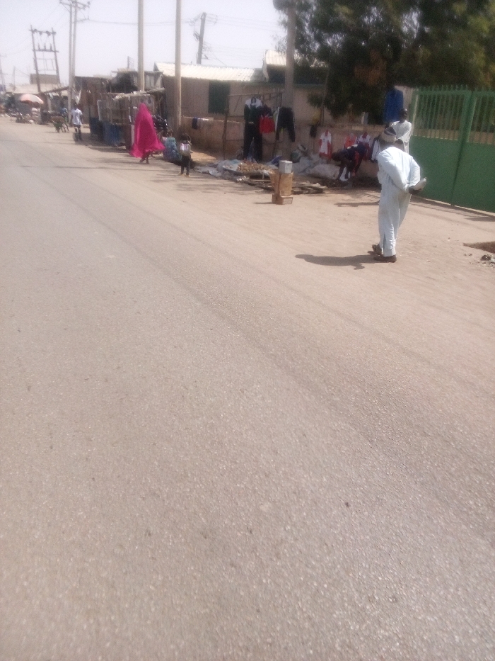 The image depicts a daytime street scene in Dakata, Nigeria, characterized by a paved road running from the foreground into the distance, bordered by a dirt shoulder on the right