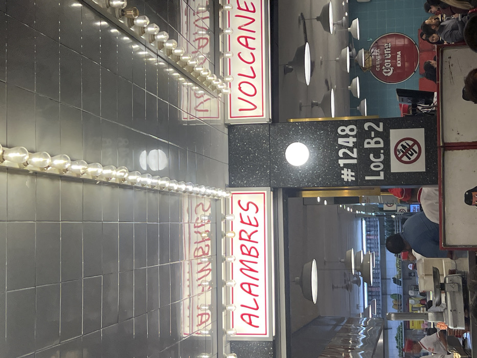 The image showcases two restaurants: "Alambres" and "Volcanes," indicated by neon-lit signs with black tile backdrops