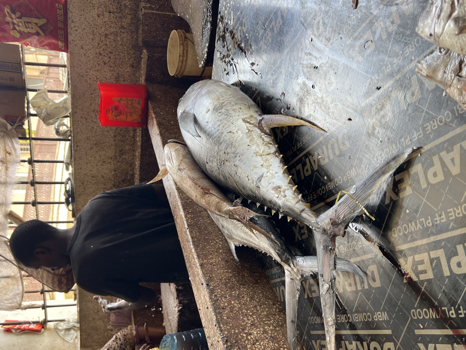 The image depicts a bustling fish market stall within the Darajani Market in Stone Town, Zanzibar City, Tanzania. In the foreground, two large, freshly caught fish are laid out on a dark, wet surface, which appears to be a sheet of plywood marked with "DURAPLEX WBP COMBI CORE PLYWOOD." The most prominent fish is a large, silver-grey specimen, consistent with a tuna, displaying subtle yellow accents on its finlets. A smaller, lighter-colored fish rests partially atop and behind the larger one. Traces of water and blood are visible on the display surface. Separating the foreground display from the background workspace is a rugged, stained concrete or stone counter. Behind this counter, a male individual, seen from the back and wearing a dark t-shirt, is actively engaged in the process of cleaning or preparing fish, with visible splashes of water around his hands. On the counter to the left of the worker is a large blue plastic bottle, while a red plastic container and a light-colored bucket are visible to his right. The background features a metal balustrade, suggesting an open window or an adjacent section of the market, allowing natural light to enter. A red bag adorned with Chinese characters is positioned in the upper right background, and light-colored fabric is draped overhead. The overall environment is functional, well-worn, and indicative of a busy fish processing area.