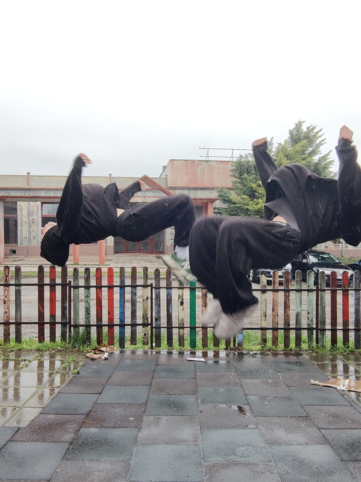 Two individuals in black hoodies and pants are captured mid-air, performing acrobatic flips, seemingly over a colorful wooden fence. The location is a public area featuring a paved surface with a wet, reflective pattern, indicative of rain. Behind the fence is a building with visible signage "S. SQUASH". In the background, a black car is parked near a green tree. The city is identified as Shumen, Bulgaria.