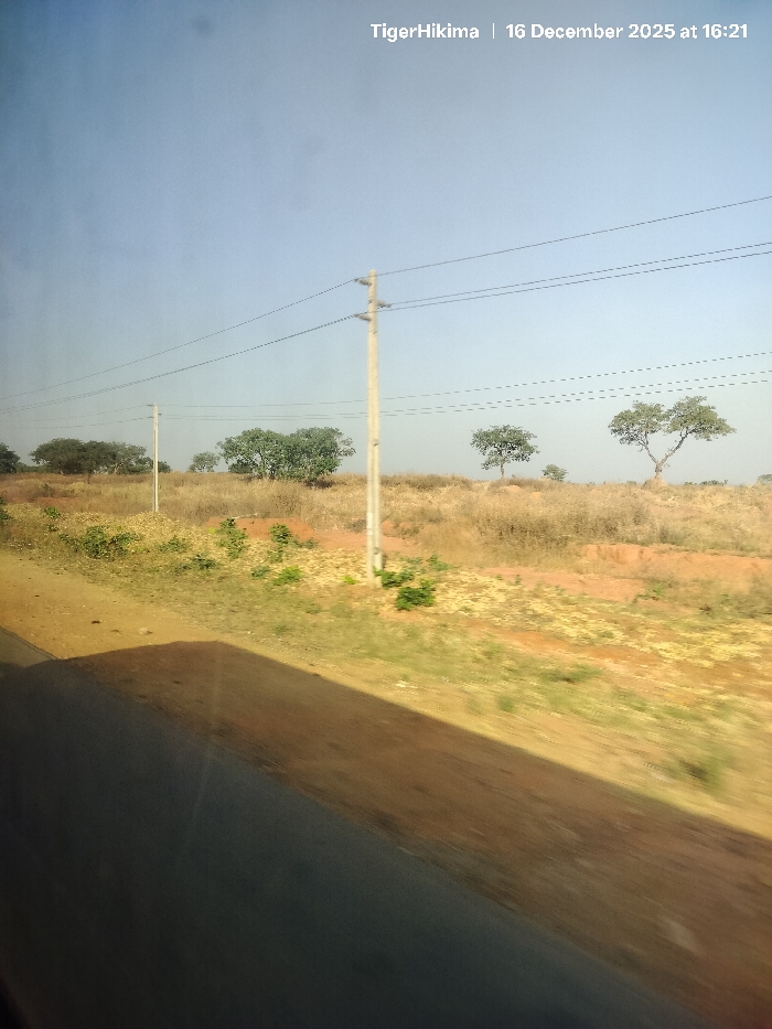 A sunny landscape with a clear, pale blue sky overhead. Three bare, electrical poles are spaced out, extending along the horizon with several wires connected to them. Scattered trees dot the distant landscape of brown grasses and sparse green vegetation. A shaded area covers the lower left section of the image. The top includes the text "TigerHikima | 16 December 2025 at 16:21".