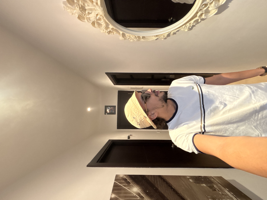 The image depicts a male individual in an indoor hallway in M'Diq ⵎⴹⵢⴰⵇ المضيق, Morocco. The subject, a man with light brown skin, dark curly hair visible beneath his hat, and a trimmed beard and mustache, is positioned in the foreground, facing slightly to his right. He is wearing a light beige bucket hat, dark sunglasses, and a white short-sleeved t-shirt with a thin dark blue collar trim and two horizontal stripes (one dark blue, one light brown) across the chest, featuring a green crocodile logo. His right arm is extended towards the camera, indicating he is taking a selfie. A dark-colored wrist accessory is visible on his left wrist. The hallway features off-white walls and a light-colored floor, partially obscured. Two dark-framed doorways, likely leading to other rooms, are visible on both sides of the hallway further back. A small framed picture is mounted on the far wall, and a recessed ceiling light is present overhead. On the right wall, a large, ornate, oval-shaped mirror with an intricately carved cream-colored frame is prominently displayed, reflecting a portion of the opposite wall. On the left wall, a large, rectangular framed artwork depicting an urban scene, possibly a bridge, in black and white or sepia tones is partially visible. The scene is brightly and evenly lit.