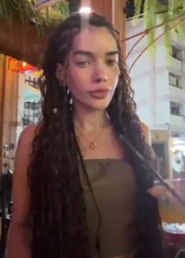 A woman with long, dark, curly hair in a braided style is sitting in what appears to be an outdoor bar or restaurant