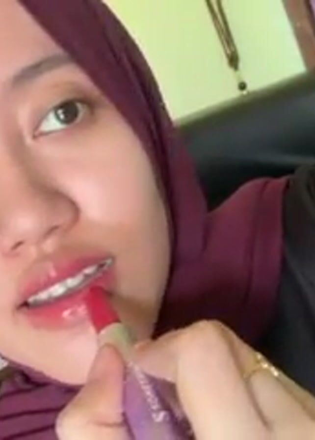 A woman wearing a maroon hijab and a black shirt is applying red lipstick to her lips. She is looking directly at the camera. She has braces. She is wearing a gold ring on her right ring finger. She has light skin. Behind her is a black leather chair and a light green wall. The brand of the lipstick is visible and appears to say "SOMETHINC".