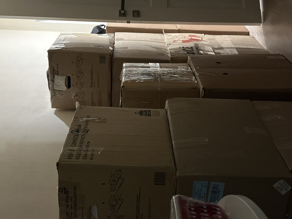 This indoor image, located in Kommunarka, Russia, displays a room predominantly occupied by stacked cardboard boxes of various sizes