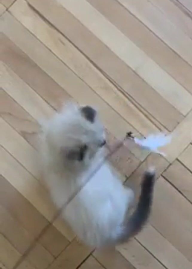 A fluffy, mostly-white kitten plays with a black toy wand on a light brown parquet floor