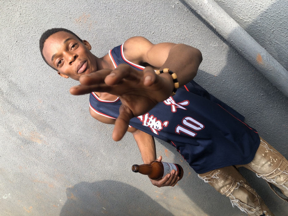 A young man in a dark blue basketball jersey with the number 10 poses with a hand outstretched. He wears a beaded bracelet and ripped, light-colored jeans. He holds an amber beer bottle in his other hand. The background shows a gray wall and part of a pipe. The image has a strong light source casting shadows on the wall and the man.