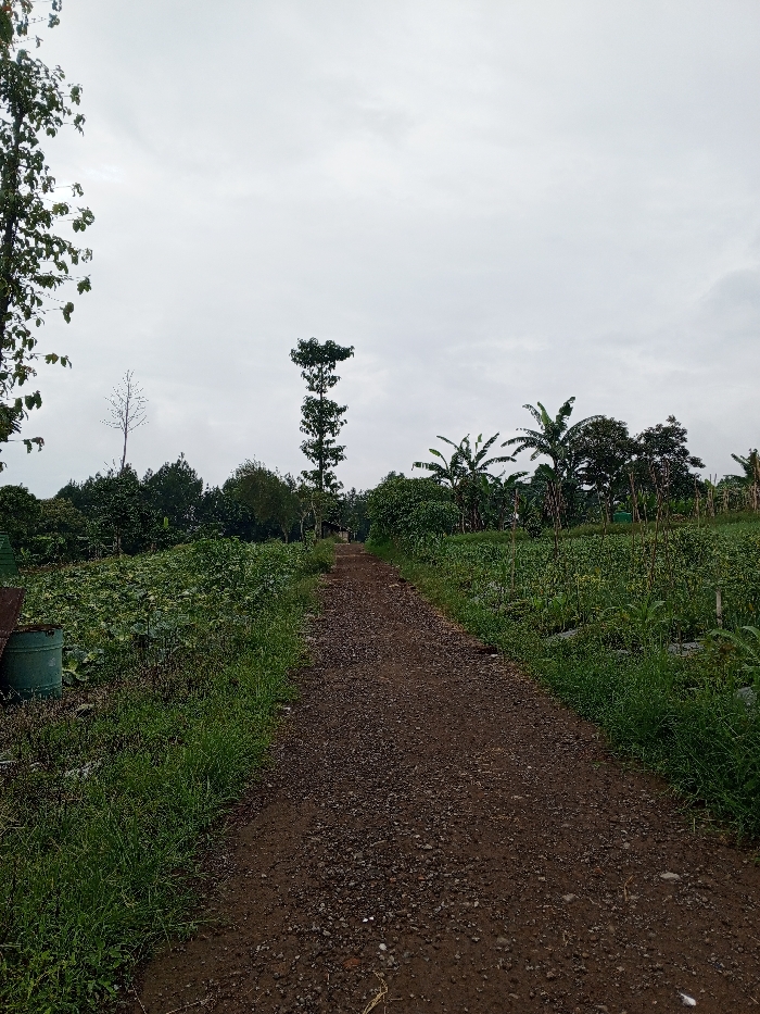 A dirt road stretches into the distance under a cloudy sky, flanked by lush vegetation. To the left, dense foliage and a solitary tall tree contrast with cultivated fields on the right. The road itself is uneven, composed of dark soil and small rocks. Banana trees and other verdant trees dot the landscape, creating a sense of rural serenity. A green barrel sits at the left. The horizon is lined with various trees.