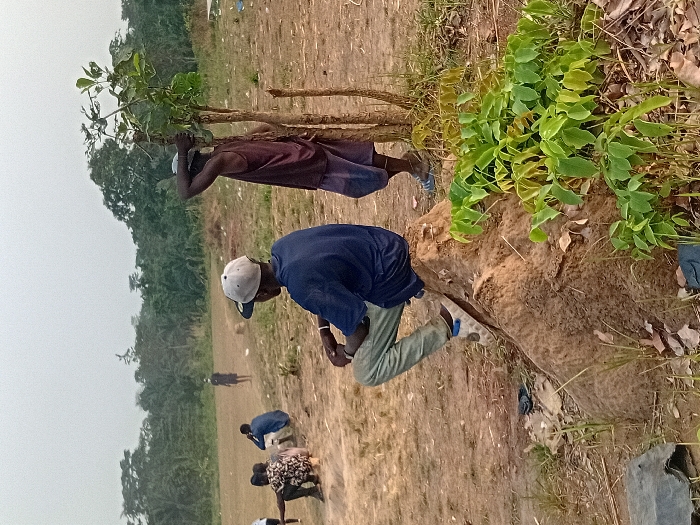 The scene is set outdoors in the city of Unknown, Chad, on a dry, open field bordered by dense vegetation under an overcast sky. In the immediate foreground, a male individual wearing a dark blue t-shirt, light-colored trousers, and a white baseball cap is seated on a large, irregular dirt mound composed of reddish-brown earth. To his right, another male individual stands, wearing a maroon sleeveless top and dark shorts, holding onto a thin tree sapling with light green foliage. Small green ground cover plants sprout around the base of the dirt mound. Further into the mid-ground left, three additional individuals are observed: one seated in a patterned shirt, another seated in a blue shirt, and a third partially obscured figure squatting or seated. In the distant background, a solitary figure stands upright in the open field, facing away from the camera. The ground consists primarily of reddish-brown, dry earth with sparse dry grass and scattered dark debris. Dense, dark green tropical or subtropical trees form the background horizon.