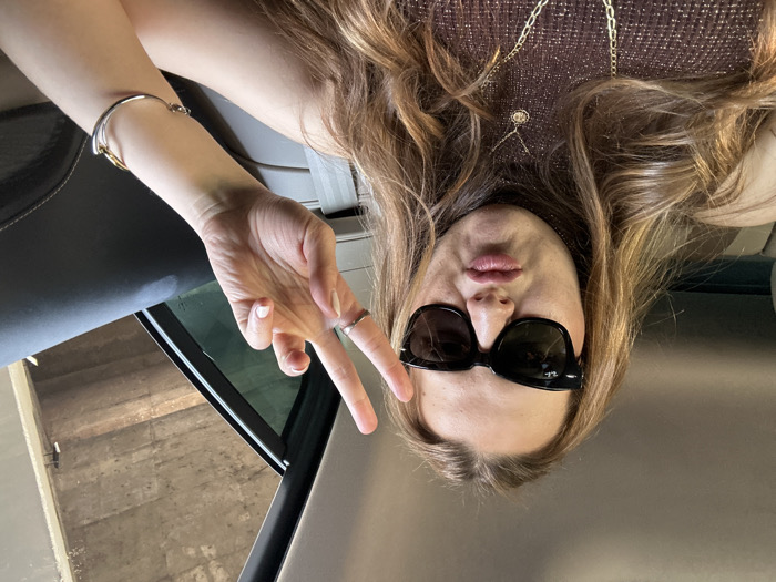 A woman in sunglasses makes a peace sign, wearing a brown, sparkly top and a delicate gold necklace. She wears a silver and gold bracelet and a ring. The photo is rotated 180 degrees. She appears to be in a car, with a window showing a concrete wall. Her blonde hair is styled loosely.