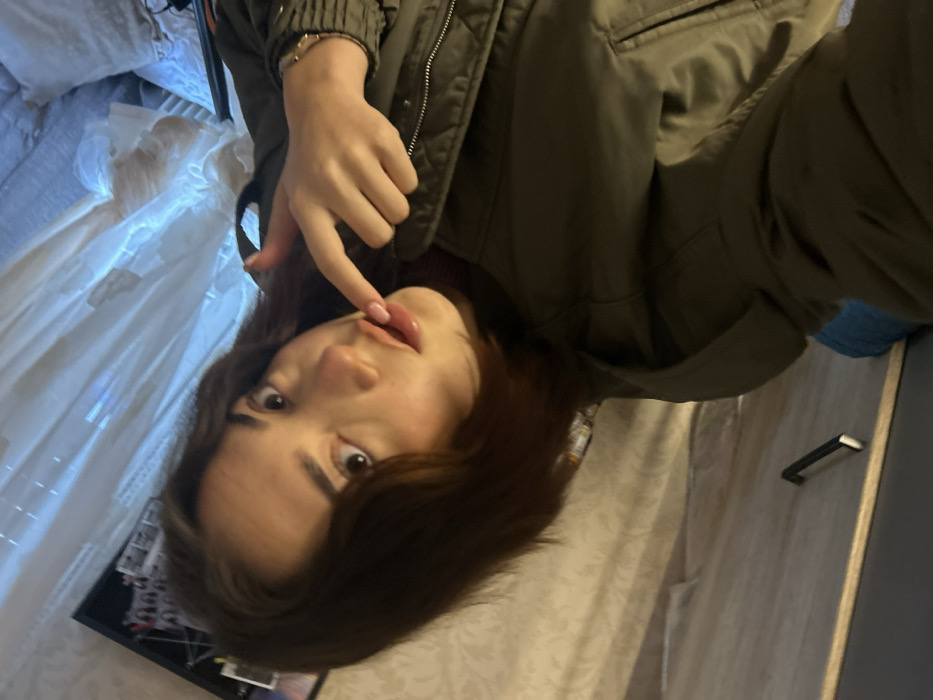 A young woman with shoulder-length dark hair is depicted in a close-up, horizontally rotated selfie, taken indoors in a residential setting in Schiltigheim, France. She has wide dark eyes, a small nose, and glossy, full lips. She is wearing a dark olive green zippered jacket over a dark red or purple garment. Her left index finger is positioned on her lower lip. A thin, light-colored bracelet is visible on her left wrist. The background features a light-colored wall with a subtle pattern on the left, where a dark-framed picture or monitor screen is mounted. On the right, light-colored fabric, possibly curtains or bedding, is visible, with a blue textile element near the lower right. The scene is illuminated by dim, ambient light.