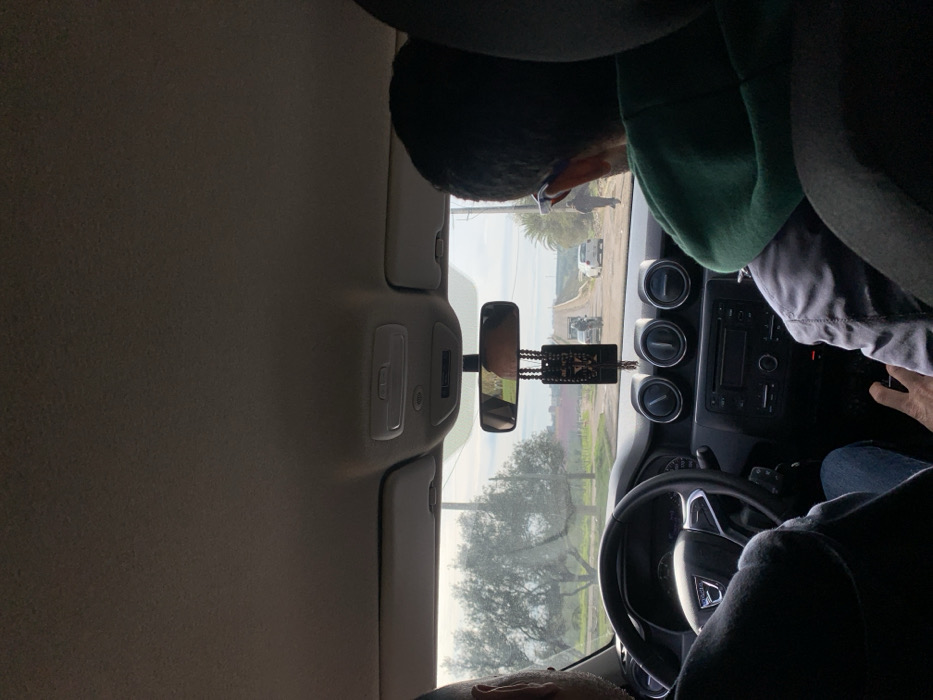This image depicts the interior perspective from a moving or stationary vehicle in Ouislane, Morocco, looking forward through the windshield. **People:** The driver, partially visible on the left, wears a dark long-sleeved garment and blue jeans, with their left hand on a steering wheel. The front passenger, visible from behind on the right, wears a green hooded sweatshirt over a grey garment; their right hand rests on a leg near the central console. Outside the vehicle, a dark-clad pedestrian walks on the right dirt shoulder in the mid-distance, and an individual on a motorcycle is present further ahead on the left side of the road. **Objects (Inside the vehicle):** The vehicle's interior features a light-colored, textured headliner, an overhead console with light-colored buttons, and two retracted sun visors. A dark, multi-beaded ornament with a rectangular pendant, featuring gold-colored designs, hangs from the rearview mirror, which shows a blurred reflection. The dashboard is dark-colored, housing a Dacia-branded steering wheel, three circular air vents, and a central infotainment/radio unit. **Objects (Outside the vehicle):** The scene outside presents an asphalt road with dirt shoulders, ascending a gentle slope into the distance. Numerous olive trees with silvery-green foliage are prominent on the left side of the road, alongside green ground vegetation. A palm tree is visible on the right. Utility poles line the road. In the mid-distance, a light-colored building is partially visible on the left. Two white sedans are parked or moving slowly on the right side of the road ahead. **Actions/Interactions:** Two individuals occupy the front seats of the vehicle, observing the external environment. A pedestrian and a motorcyclist are traversing the road ahead.