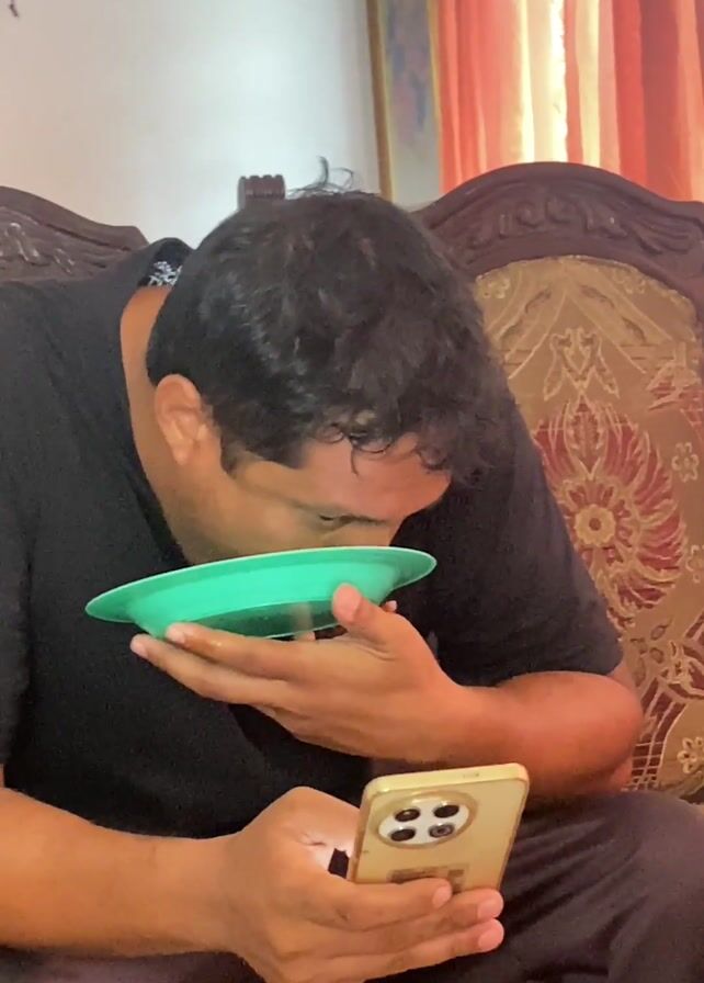 A medium shot shows a man seated on a cushioned chair. He is wearing a black t-shirt and dark brown pants. He is looking at his gold-colored smartphone while simultaneously eating from a green plate. The man brings the plate to his face and eats small pieces from it with visible concentration. The background features a painting hanging on the wall and a partially visible orange curtain. The chair is intricately designed with dark wood and a patterned cushion.