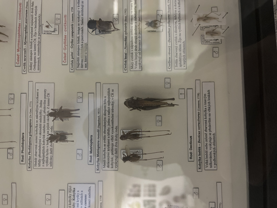 An overhead view captures a detailed section of a biological display case, likely within a museum or educational institution in the Capital City of Prague, Czechia. The case features a white background against which numerous pinned insect specimens, predominantly grasshoppers and crickets, are meticulously arranged for taxonomic study. The display is segmented by horizontal and vertical lines, with each section dedicated to specific insect species. Each species is identified by its genus ("Rod") and scientific name, followed by a detailed description in Czech. Gender symbols (♂ for male, ♀ for female) are consistently placed next to individual specimens to indicate their sex. Key insect groups visible include: * **Pholidoptera griseoaptera:** Two dark brown, robust specimens (male and female) are pinned in the upper-left, characterized by short wings. * **Metrioptera roeselii:** Three specimens (two males and one female) are shown in the mid-left. These are generally more slender, with long antennae, and one male has visible hind wings. * **Decticus verrucivorus:** A large, dark brown specimen, likely a female due to the visible ovipositor, is partially visible towards the bottom-left. * **Myrmecophilus acervorum:** A single, minute, light-colored specimen is pinned in the upper-right, representing an ant cricket. * **Gryllus campestris:** A robust, dark specimen, likely a male field cricket, is pinned in the mid-right. * **Nemobius sylvestris:** A small, reddish-brown forest cricket is displayed in the lower mid-right. * **Oecanthus pellucens:** Two slender, light-colored specimens (one significantly smaller, likely a male) are pinned onto white paper strips in the bottom-right. The display exhibits a clear organizational structure, using text labels for scientific classification and descriptions of morphology and habitat. The insects are preserved in a lifelike posture, pinned through the thorax. Reflections are visible on the protective glass surface of the display case, along with soft shadows cast by the objects, indicating an indoor, lit environment. No individuals are present in the image.