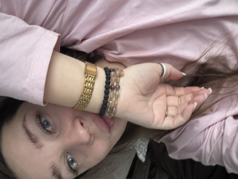 A female individual is depicted in a close-up, selfie-style image. Her right arm is raised, with the hand partially obscuring the left side of her face. She has light blue eyes, a silver nose ring on her right nostril, and her lips are slightly parted in a pout. Her long eyelashes and well-groomed eyebrows are visible. She wears a light pink long-sleeved garment. Her right wrist is adorned with a gold-toned watch featuring a link band, and several beaded bracelets below it, including one with black beads and others with smaller, translucent and opaque beads in brown and amber tones, one with a small, round metallic charm. Her right hand displays a thin silver-colored ring on her ring finger and a black and white two-toned ring on her middle finger. Her fingernails have white tips, indicative of a French manicure. Her brown hair is visible behind her arm and shoulder. The background is out of focus, revealing a dark brown fabric object to the left and further pink fabric to the right, consistent with an indoor setting. The specific location within the city of Chaikovsky, Russia, cannot be determined from the visual information provided in the image.