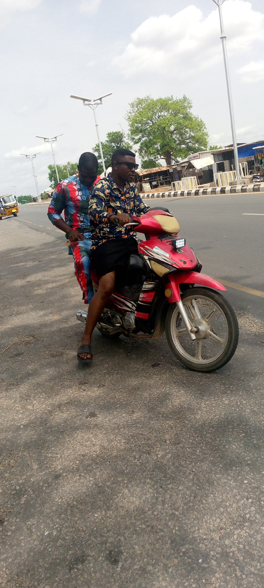 Two men are riding a red motorcycle on a paved road in Adankolo, Nigeria. The driver wears a patterned shirt, sunglasses, and dark shorts. The passenger is wearing a patterned shirt and pants. Both men are wearing sandals. There are streetlights along the road, and a yellow auto rickshaw is visible on the left side of the road. Buildings are visible in the background.