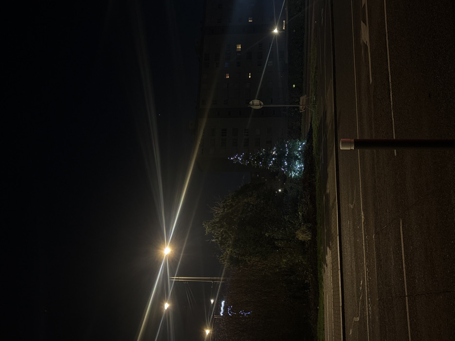 Night scene featuring a dimly lit urban street beside a building. Streetlights cause lens flares across the frame. A decorated Christmas tree stands on a patch of greenery near the sidewalk. To the right, the asphalt street is visible with dividing lines.