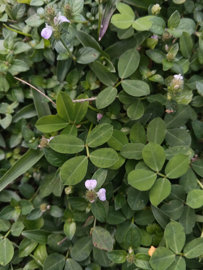 The image presents a close-up, overhead view of dense ground-level vegetation, depicting flora consistent with that found in Baglung, Nepal. The primary subjects are various green plants and small flowering plants. The scene is dominated by overlapping green leaves of differing shapes and sizes. A prominent plant species features groups of four dark green, broadly oval to somewhat heart-shaped leaves. Interspersed throughout this foliage are several instances of a flowering plant. This plant exhibits small, pale purple flowers, each bilobed (two-lipped) and approximately 1-2 cm in width, emerging from a cluster of hairy, green-brown bracts at the top of short stems. Some flowers are fully open, revealing their delicate structure. The overall environment is natural and organic, with no discernible human presence, animals, or artificial objects. Lighting indicates natural daylight conditions.
