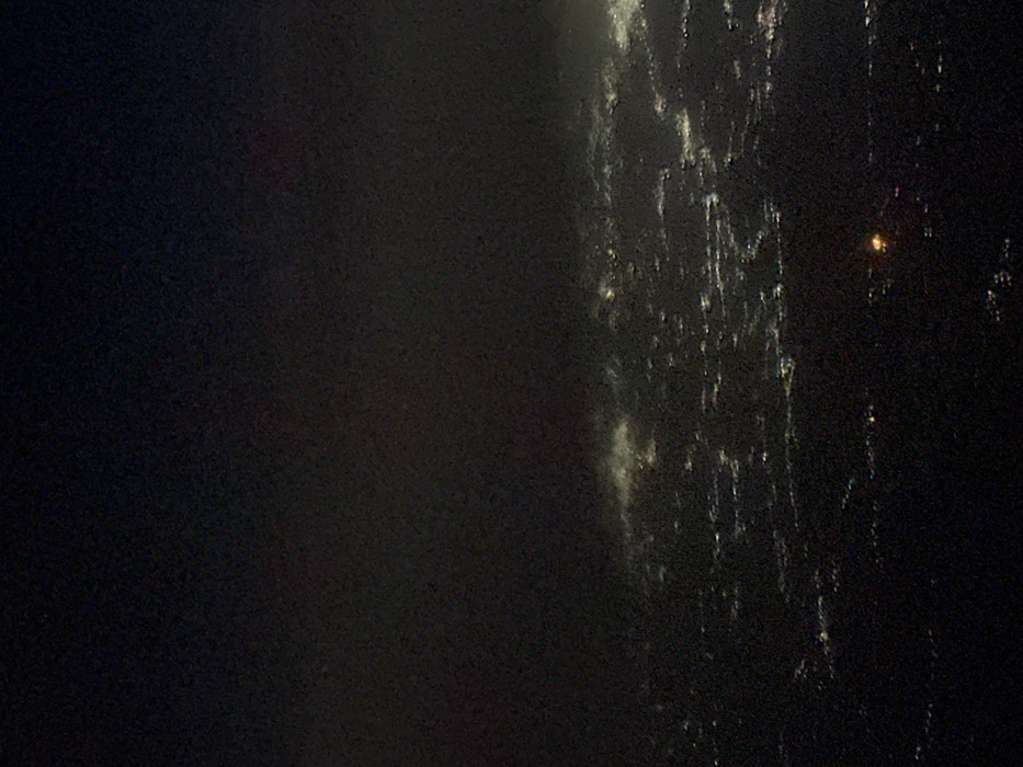 A dim, dark, and slightly grainy image reveals a blurred scene. The left side appears predominantly dark, with subtle variations in shading. Moving right, there's a shift as light elements appear. These are mostly vertical and irregular in shape, suggesting possible streaks or reflective surfaces, perhaps raindrops on glass at night with a single light source visible in the dark beyond.