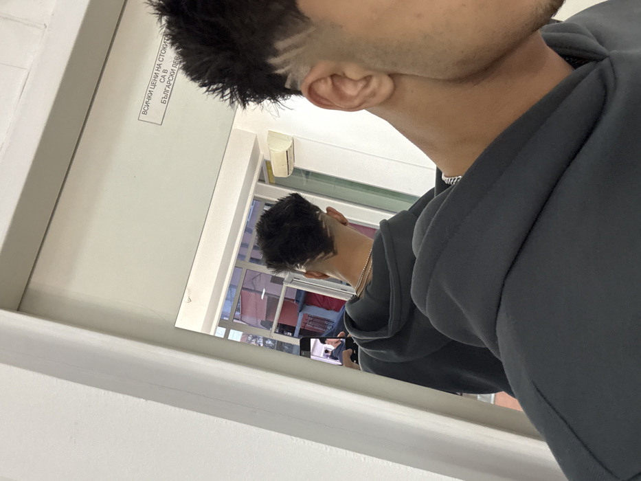 A male individual is depicted in an indoor commercial establishment in Nesebar, Bulgaria. He is taking a mirror selfie, capturing his new haircut. The primary subject's right profile is visible in the foreground, showcasing his ear, jawline, and the right side of his head, which features a styled haircut with spiky texture on top and several parallel shaved lines forming an upward-diagonal pattern above his ear. He wears a dark gray hooded sweatshirt and a silver chain necklace. His reflection in a large, rectangular wall-mounted mirror occupies the central background, showing him from behind. This reflection clearly displays a V-shaped shaved design at the nape of his neck. In the reflection, his right hand is visible, holding a smartphone to capture the image. Text in Cyrillic script is adhered to the upper right portion of the mirror, stating: "ВСИЧКИ ЦЕНИ НА СТОКИТЕ СА В БЪЛГАРСКИ ЛЕВА" (All prices of goods are in Bulgarian Leva), confirming the commercial environment and location. A white wall-mounted air conditioning unit is present on the right wall, partially visible in the mirror's reflection. Through a window or glass door, visible in the mirror to the left of the reflected subject, an exterior urban scene with multi-story buildings and a street is discernible. The interior walls are painted white.